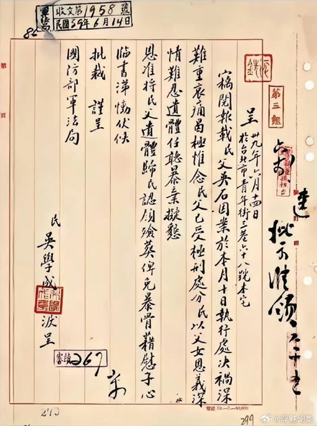 窃阅报载 民父吴石因案 于本月十日执行处决 祸深难重 哀痛曷极 惟念民父己受极刑处分 民以父女恩义深情 难忍遗体任听暴弃 擬懇(空白处应该是人名被隐匿)恩准将民父遗体归民认领殓葬 俾免暴骨籍慰子心 临书涕慟伏候 批裁 谨呈 国防部军法局