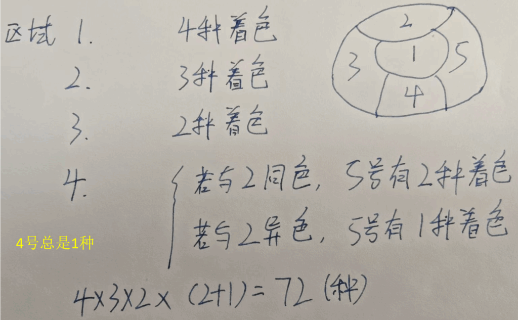 一个地区分成5个行政区,现在给地图着色,要求相邻区域不得使用同一颜色,现在有4种颜色可供选择,则不同的着色方案有多少种?